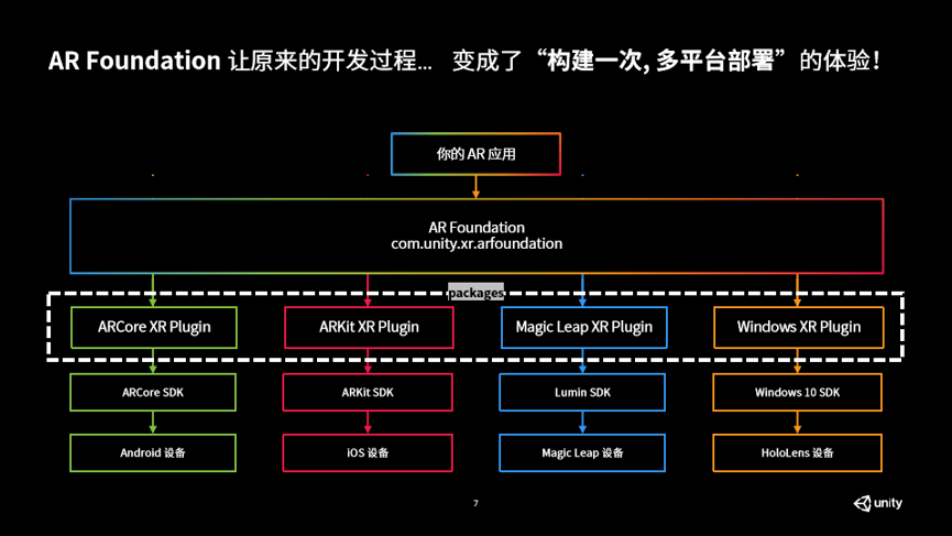 在ARFoundation诞生之前,如果我们需要开发一个多平台的AR应用,会使用 ARCore XR Plugin 开发一个Android设备版本,使用 ARKit XR Plugin 开发一个iOS设备版本。由于底层API的不同,这样我们就需要同时维护多份代码,这无疑增加了我们工作量和开发成本。因此Unity利用其跨平台的优势,开发了一个与平台无关的AR开发工具包,将 ARCore XR Plugin 、ARKit XR Plugin、Magic Leap XR Plugin、Windows XR Plugin 等AR开发工具包,进行了二次封装,统一API,只需要写一份代码就可以发布到多平台,它会根据我们发布的平台自主选择底层SDK。Unity将这个AR开发工具包命名为“ARFoundation”。