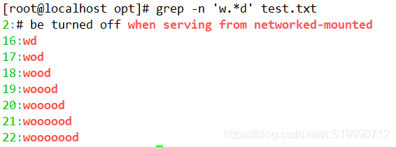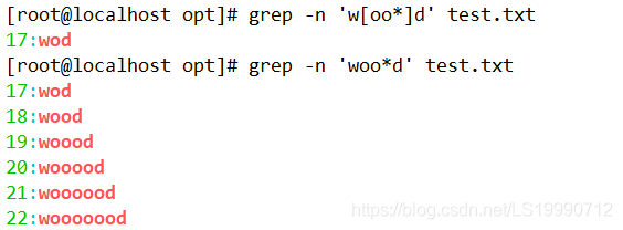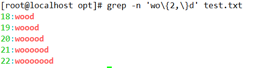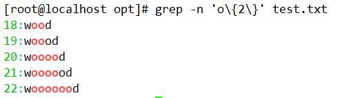 (2)在上述结果中,“wood”字符串“w..d”匹配规则。若想要查询 oo、ooo、ooooo 等资料,则需要使用星号(*)元字符。但需要注意的是,“*”代表的是重复零个或多个前面的单字符。“o*”表示拥有零个(即为空字符)或大于等于一个“o”的字符,因为允许空字符,所以执行“grep –n‘o*’test.txt”命令会将文本中所有的内容都输出打印。如果是“oo*”, 则第一个 o 必须存在,第二个 o 则是零个或多个 o,所以凡是包含 o、oo、ooo、ooo,等的资料都符合标准。同理,若查询包含至少两个 o 以上的字符串,则执行“grep –n‘ooo*’ test.txt”命令即可。