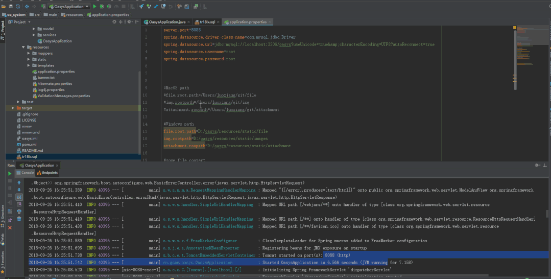 1.下载项目、把oasys.sql(原tr18lx.sql)导入本地数据库 2. 修改application.properties, 3. 修改数据源,oasys——>自己本地的库名,用户名和密码修改成自己的 4. 修改相关路径,配置图片路径、文件路径、附件路径 5. OasysApplication.java中的main方法运行,控制台没有报错信息,数据启动时间多久即运行成功 6. 在浏览器中输入localhost:8088/logins