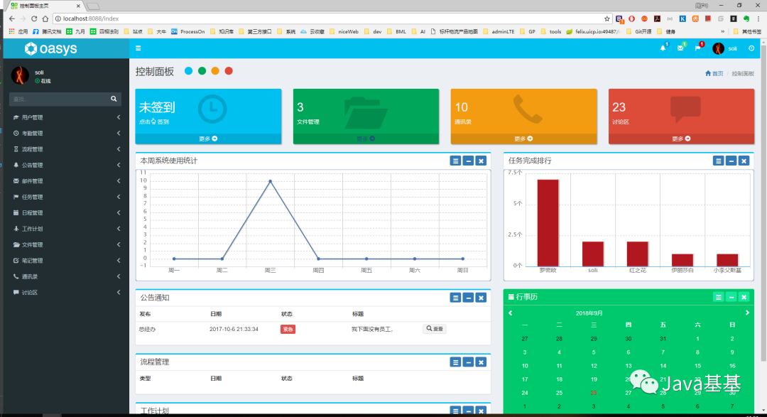 oasys是一个OA办公自动化系统,使用Maven进行项目管理,基于springboot框架开发的项目,mysql底层数据库,前端采用freemarker模板引擎,Bootstrap作为前端UI框架,集成了jpa、mybatis等框架。作为初学springboot的同学是一个很不错的项目,如果想在此基础上面进行OA的增强,也是一个不错的方案。