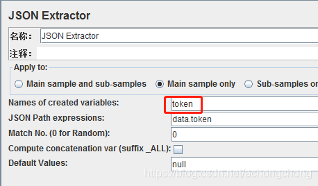 1、在一个请求响应中,通过JSON Extractor获取局部变量值,命名为token