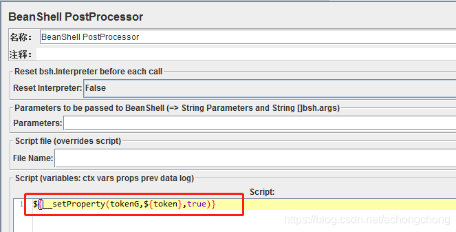 1)脚本输入:${__setProperty(tokenG,${token},true)}