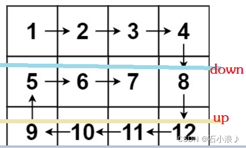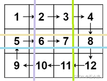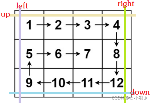 输出:[1,2,3,4,8,12,11,10,9,5,6,7]只需要定义上下左右四个边界, 然后遍历完(行或者列)之后更新边界(一圈一圈遍历, 缩小上下左右边界即可), 直到上边界大于下边界或者左边界大于右边界, 下边界小于上边界, 右边界小于左边界, 说明遍历完成。