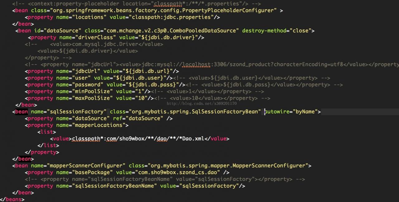 此时我们配置了PropertyPlaceholder,以及MapperScannerConfigurer。此时MapperScannerConfigurer通过ref引入了sqlSessionFactory。