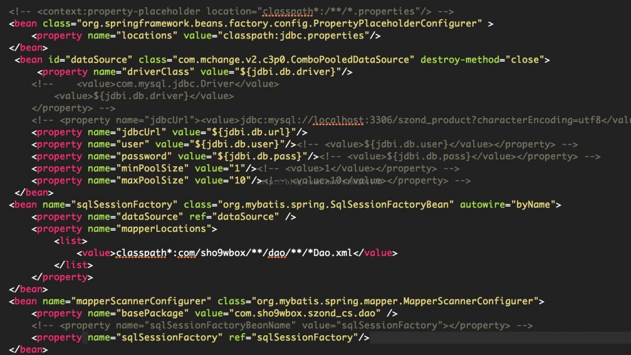 前面说到spring预先加载了MapperScanner这个类,而又通过ref引入了SqlSessionFactory。造成直接加载了DataSource.而此时还未加载Properties解析类,因此spring无法解析EL表达式。