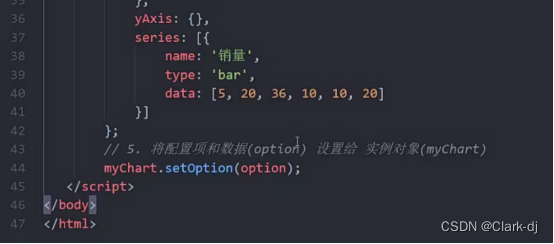 var option = { xAxis: { type: 'category', data: ['Mon', 'Tue', 'Wed', 'Thu', 'Fri', 'Sat', 'Sun'] }, yAxis: { type: 'value' }, series: [{ data: [820, 932, 901, 934, 1290, 1330, 1320], type: 'line' }] };将配置项设置给echarts实例对象