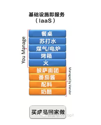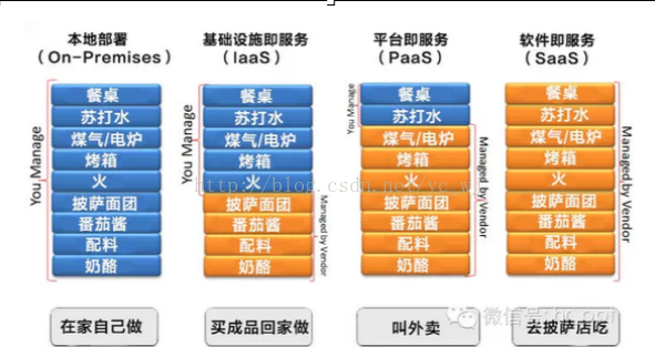 通过吃披萨的案例,再回想一下我们的云计算分层,这两者是不是都是为了得到某些服务(吃到披萨或得到云计算服务)呢?那实现的方法应该也类似,我们直观对比一下。