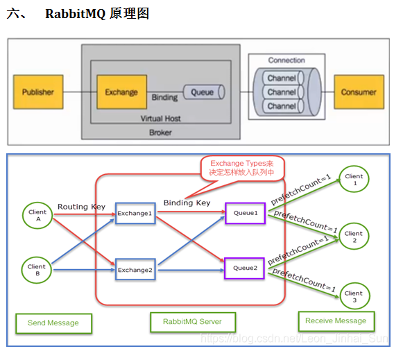 原理结构图,先不着急看第二个图,先来看第一个,其实这个图介绍了RabbitMQ一个消息的提供者发送消息,