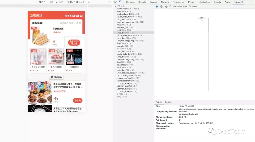 比如上边提到的栏目页面,就因为平时开发的不注意造成页面生成了过多的合成层,我在试图查看页面合成层情况的时候,在 PC 上已经能明显感到卡顿了。利用 Chrome Devtools 分析之后不难发现,页面里边存在的一个带动画 transform 的 button 按钮,提升为了合成层,动画交叠的不确定性使得页面内其他 z-index 大于它但其实并没有交叠的节点也都全部提升为了合成层(这个原因真的好坑)。