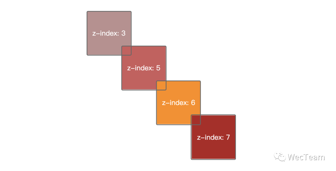 还是之前的模型,只不过这次不同的是,有四个 absolute 定位的 div 在屏幕内发生了交叠。此时处于最下方的 div 在加上了 CSS 属性