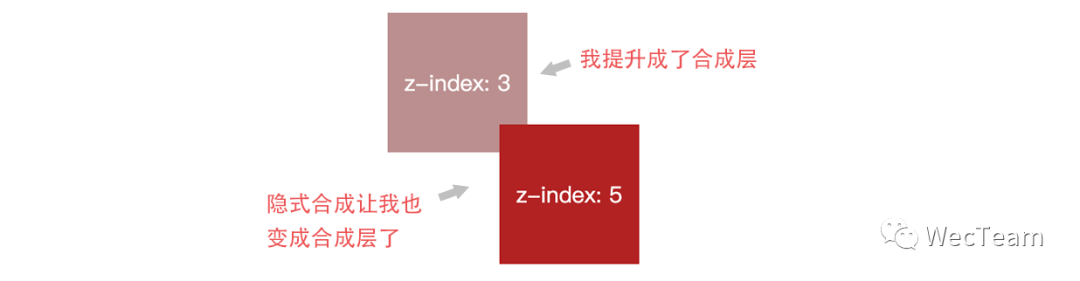 This is called implicit compositing: One or more non-composited elements that should appear above a composited one in the stacking order are promoted to composite layers. (一个或多个非合成元素应出现在堆叠顺序上的合成元素之上,被提升到合成层。)