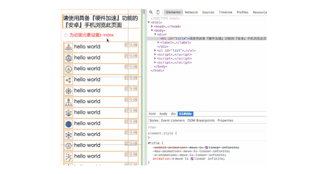 消除隐式合成就是要消除元素交叠,拿这个 DEMO 来说,我们只需要给 h1 标题的 z-index 属性设置一个较高的数值,就能让它高于页面中其他元素,自然也就没有合成层提升的必要了。点击 DEMO 中的复选按钮就可以给 h1 标题加上一个较大的 z-index,前后效果对比十分明显。
