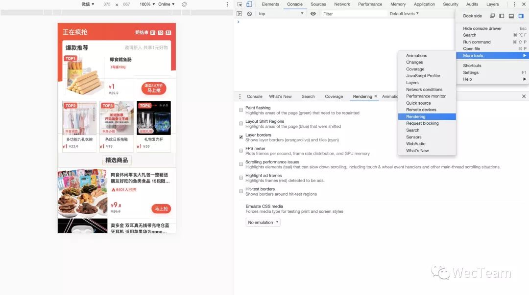 首先是看看页面的渲染情况,以一个栏目页为例,点击 More tools -> Rendering,选择 Layer borders,你就能看到页面中的合成层都带上了黄色边框。