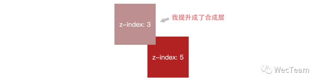 <style>.bottom, .top {position: absolute;will-change: transform;}.bottom {width: 100px;height: 100px;top: 20px;left: 20px;z-index: 3;background: rosybrown;}.top {width: 10px;height: 10px;transform: scale(10);top: 200px;left: 200px;z-index: 5;background: indianred;}</style><body><div class="bottom"></div><div class="top"></div></body>