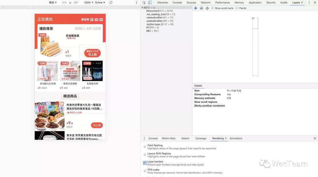 层合成的特性给我们提供了一个利用终端硬件能力来优化页面性能的方式,对于一些重交互、重动画的页面,合理地利用层合成可以让页面的渲染效率得到极大提升,改善交互体验。而我们需要关注的是如何规避层合成对页面造成的负面影响,或者换个说法来讲,更多时候是如何权衡利害,合理组织页面的合成层,这就要求我们事先要对页面的层合成情况有一个详细的了解。Chrome Devtools 给我们提供了一些工具,可以方便的查看页面的合成层情况。