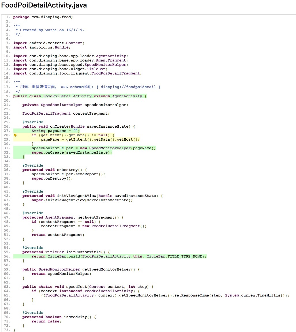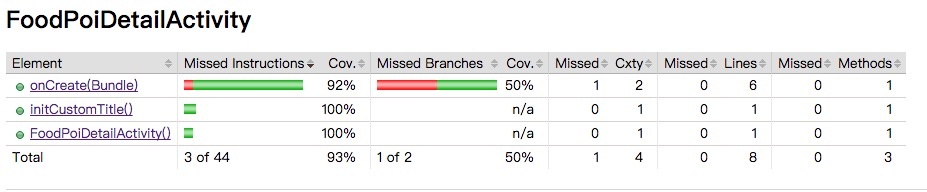 这样就能生成新增代码的覆盖率报告。如下图所示本次commit只修改了FoodPoiDetailActivity的onCreate和initCustomTitle这两个方法,那么覆盖率只涉及这些修改了的方法: