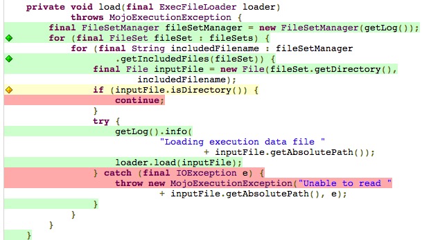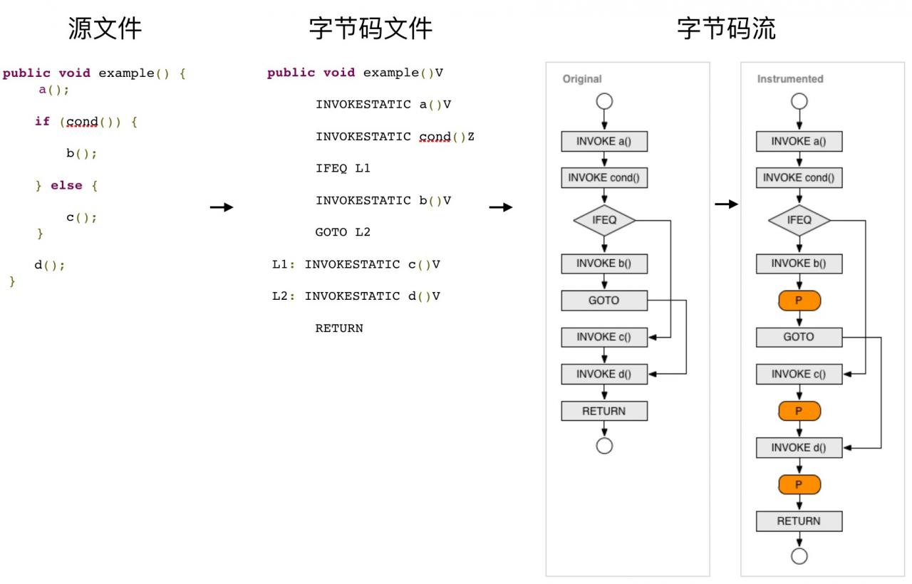 JaCoCo通过ASM在字节码中插入Probe指针(探测指针),每个探测指针都是一个BOOL变量(true表示执行、false表示没有执行),程序运行时通过改变指针的结果来检测代码的执行情况(不会改变原代码的行为)。探测指针完整插入策略请参考Probe Insertion Strategy。