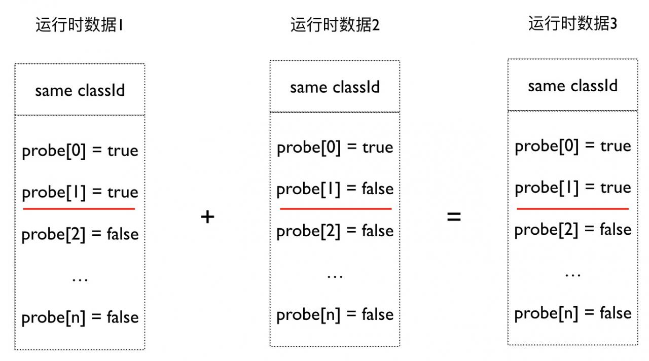 上面可以看到,因为获取时机比较多,可能会得到多份运行时数据,对于这些数据,可以通过JaCoCo的mergeTask把ClassId相同的运行时数据进行merge。如下图所示,JaCoCo会对ClassId相同的运行时数据进行merge,并对相同位置的probe指针取或: