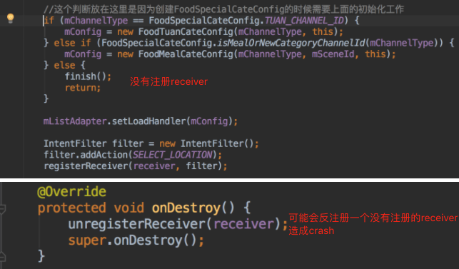 以上代码可能在onDestory时反注册一个没有注册的receiver而发生崩溃。如果开发同学经验不足、自测不够充分或者代码审查不够仔细,这个bug很容易被带到线上。