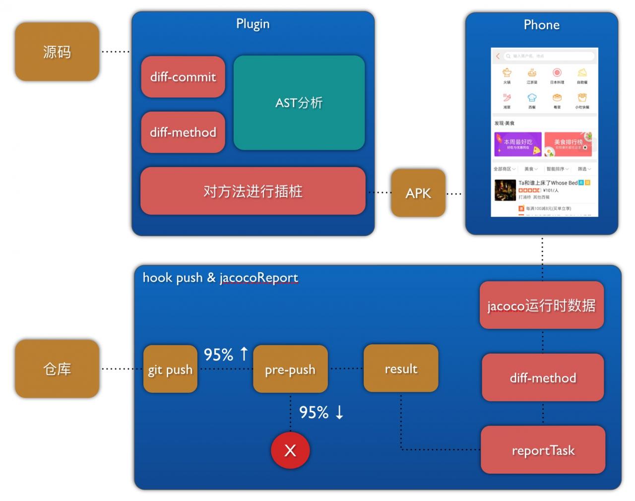 整个工具通过Gradle插件的形式部署到项目中,在项目编译阶段完成新增代码的查找和注入,在最终push代码之前获取当前设备的运行时数据,然后生成覆盖率报告,并把覆盖率低于一定值(默认是95%)的提交abort掉。