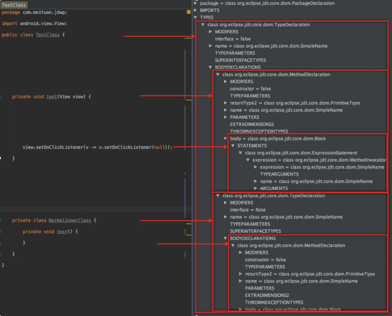下面通过Android Studio的JDT-View插件来表示一个简单的抽象语法树结构,左边是源码,右边是解析完以后的抽象语法结构: