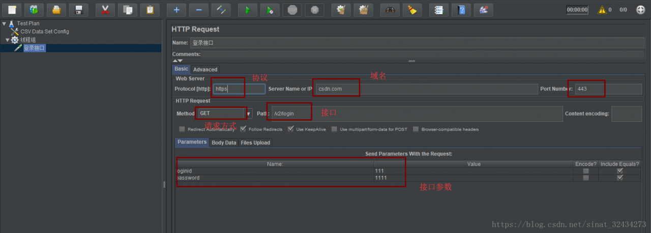 添加完http请求后,填写对应的域名、接口以及请求参数,如下图所示: