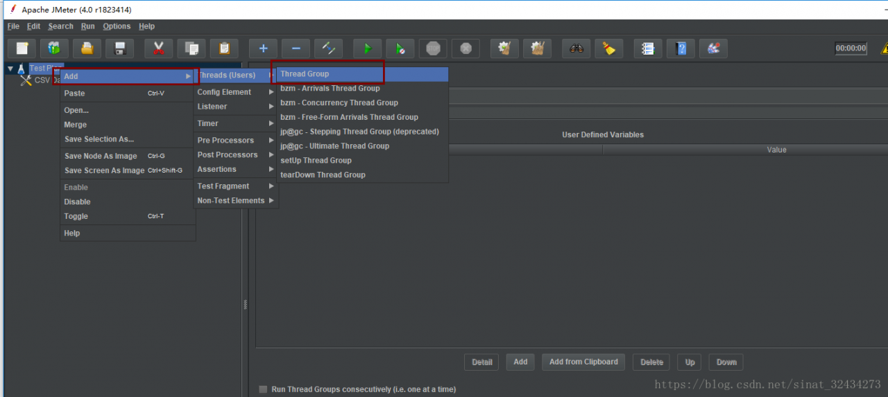 在“测试计划”上点击鼠标右键-->添加-->threads(Users)-->线程组。