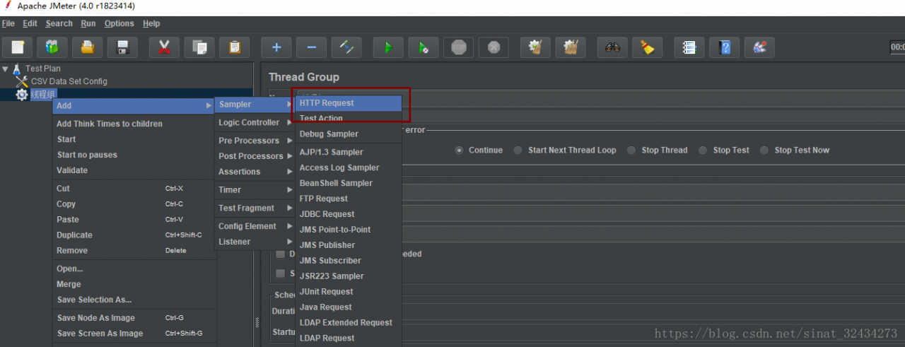在“线程组”打开鼠标右键-->添加-->sampler-->http请求