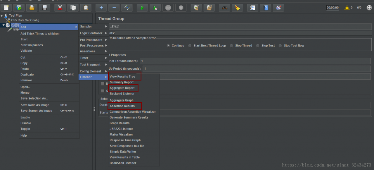在“线程组”打开鼠标右键-->添加-->监听器-->察看结果树、断言结果、聚合报告