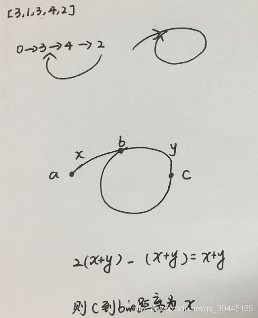 分析题目可以知道最容易想到的是使用哈希表对nums中出现的数字进行计数,因为使用是python语言所以可以使用collections.defaultdict(int)声明一个字典对nums中出现的数字进行计数,使用这个方法是最简单而且是比较高效的。除了这种方法之外,在y总的视频中讲到的是另外一个思路是寻找环的起点,感觉这种方法还是比较难想到的,其实我们可以将这些数字通过下标的方式连接起来,例如[3,1,3,4,2]可以表示为下图的形式,这样使用下标连接数字的时候那么相当于表示为链表的形式,从图中可以知道至少有两个起点指向的数字那么就是重复的数字,所以问题等价于寻找环的起点。寻找环的起点的经典方法是使用快慢指针a, b,慢指针每次走一步,快指针每次走两步这样因为存在环所以最终两个指针肯定会在一个位置相遇,假设两个指针相遇在下图中的c点,因为第一次相遇的时候快指针比慢指针肯定是多走一圈的,而且快指针比慢指针多走一倍的路程,所以根据这些关系我们得到图中c点到b点的长度为x,这样当两个指针相遇的时候我们令一个指针从最开始的位置走,另外一个指针从当前位置开始走,最终两个指针相等的位置就是环的起点。