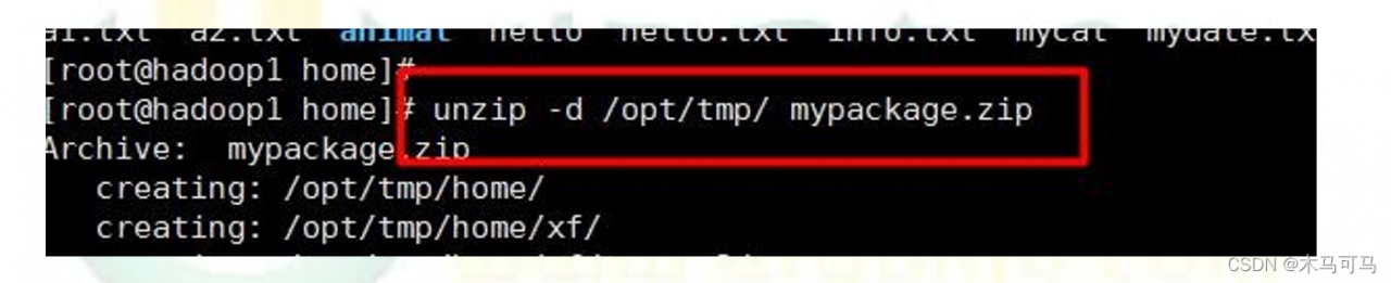 unzip -d /opt/tmp/ mypackage.zip (解压到的目录再解压的包)