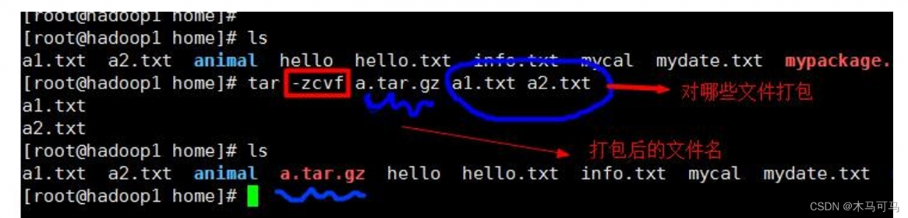 eg1:压缩多个文件,将 /home/a1.txt 和 /home/a2.txt 压缩成 a.tar.gz