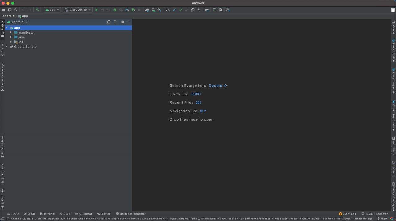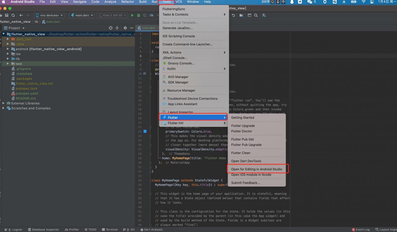 用Android Studio打开创建好的Flutter项目,在Android Studio顶部菜单Tools->Flutter->Open for Editing in Android Studio,