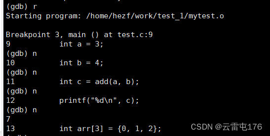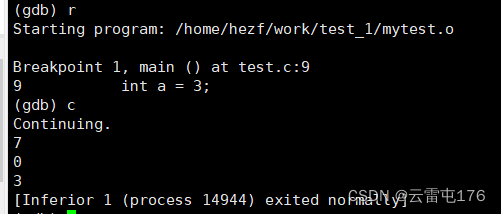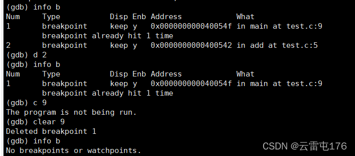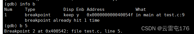 如果你和我一样是个初学者,在这里我们只需要注意两个点,其一,是断点的编号,及Num下的数字;其二,则是断点信息最后的那一句in main at test.c:9,即断点在mian函数当中,文件的第九行行。而编号与所在行数也是会在你设置断点时反馈给你的。如图片最后一行。
