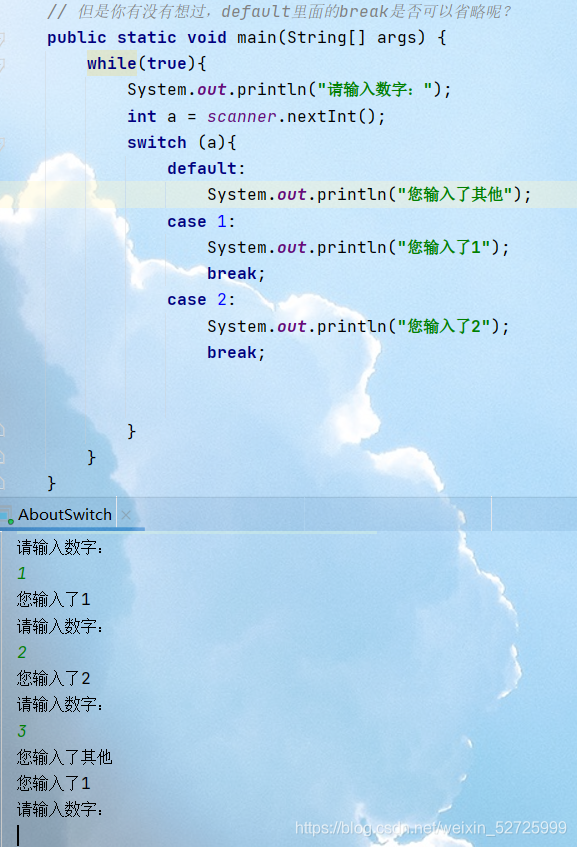 如果default在switch的最后的话,作者认为,是可以省略的,因为即使往下在运行也是终止的},有无break都会终止switch,所以得出结论,default如果在switch的尾部,那么break可以省略。