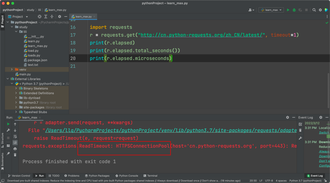 2、如下请求,设置超时为1s,那么就会抛出这个异常:requests.exceptions.ReadTimeout: HTTPConnectionPool