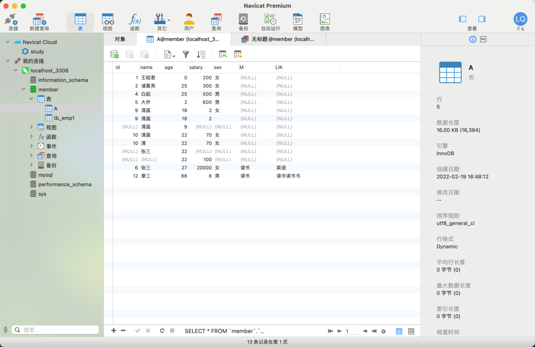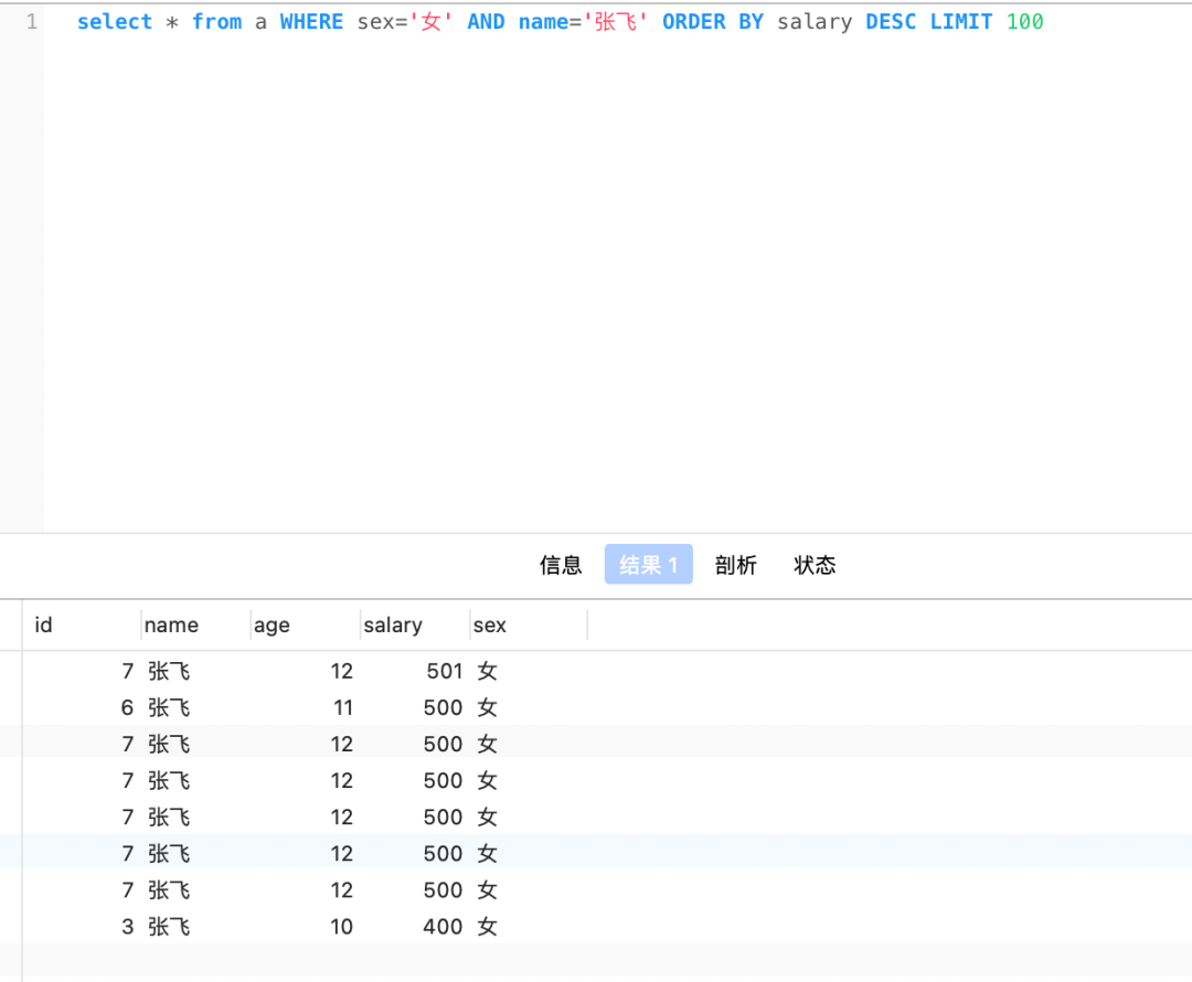 1.查询A表中100条数据,查出其中性别是女,名字为张飞的人,根据工资做个倒序排序。