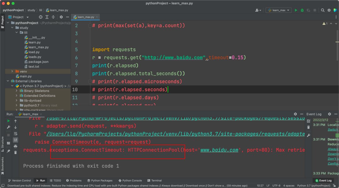3、如下请求,设置超时为0.15s,那么就会抛出这个异常:requests.exceptions.ConnectTimeout: HTTPConnectionPool