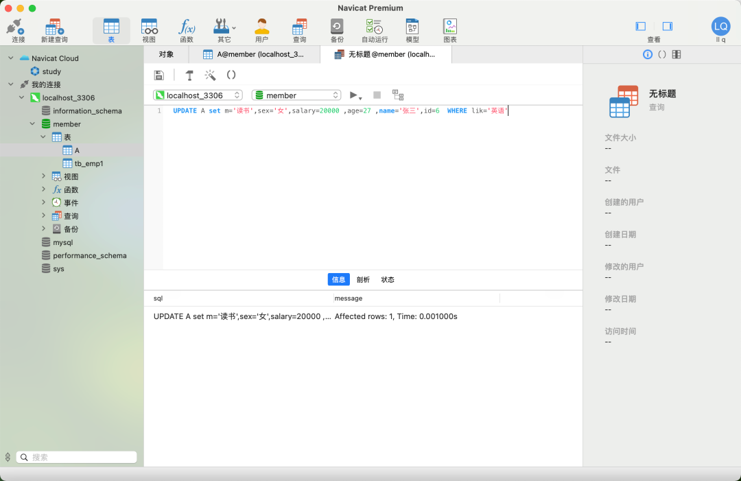 UPDATE A set m='读书',sex='女',salary=20000 ,age=27 ,name='张三',id=6 WHERE lik='英语'