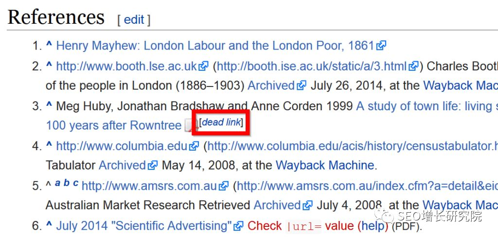 当一个维基百科的编辑偶然发现一个死链接,他们不会马上删除链接,而是链接旁边添加了一个脚注,写着“dead link”, 这就是我们的好机会。