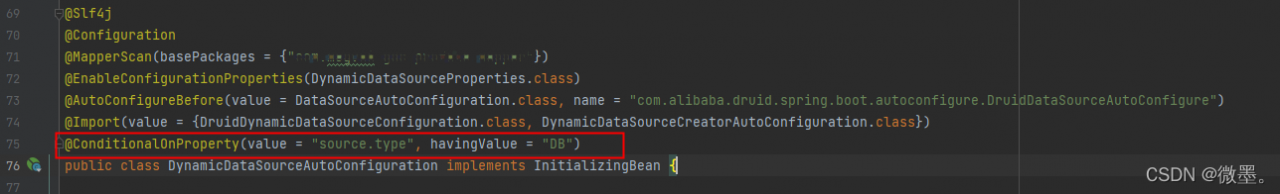 2、重写baomidou/dynamic-datasource-spring-boot-starter 的DynamicDataSourceAutoConfiguration.class 类,将启用条件换成source.type