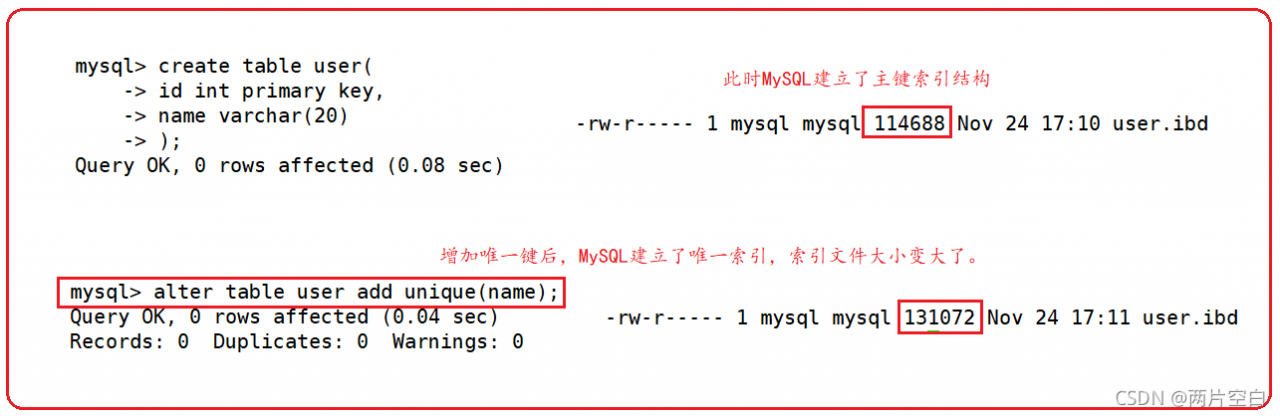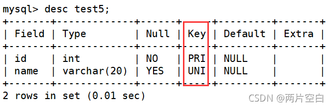 create table test5( id int primary key, name varchar(20) unique);- 第二种方式