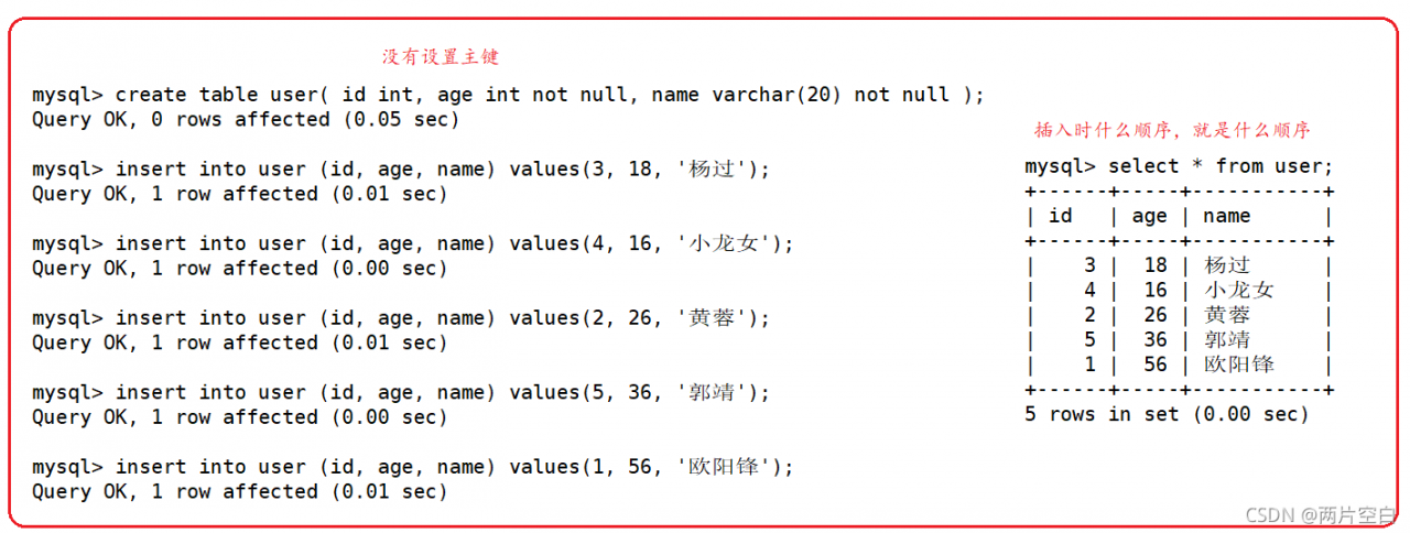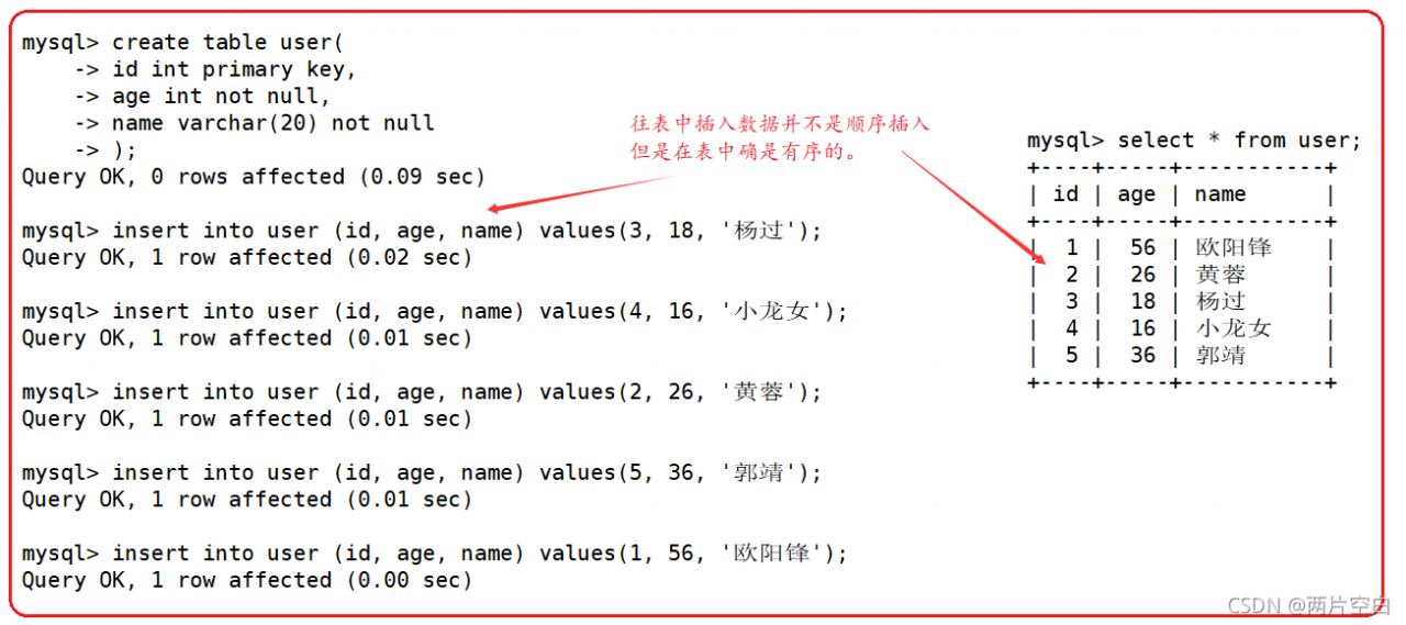 如果有主键,MySQL会按照主键给我们的数据进行排序。