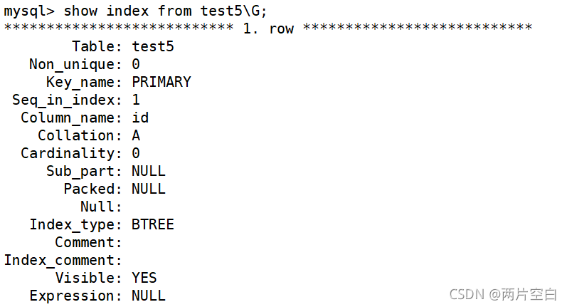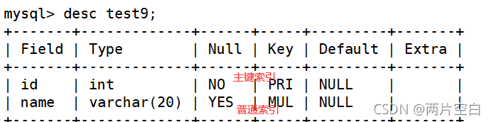 create table test8( id int primary key, name varchar(20), index(name));- 第二种方式