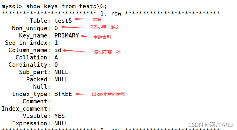 注意:上面的索引结构,在创建时,MySQL会自动创建对应索引结构。比如:创建表时,设置主键后,MySQL会自动创建主索引。唯一键创建后,MySQL会自动创建唯一索引。普通索引在创建后,也会自动创建等。