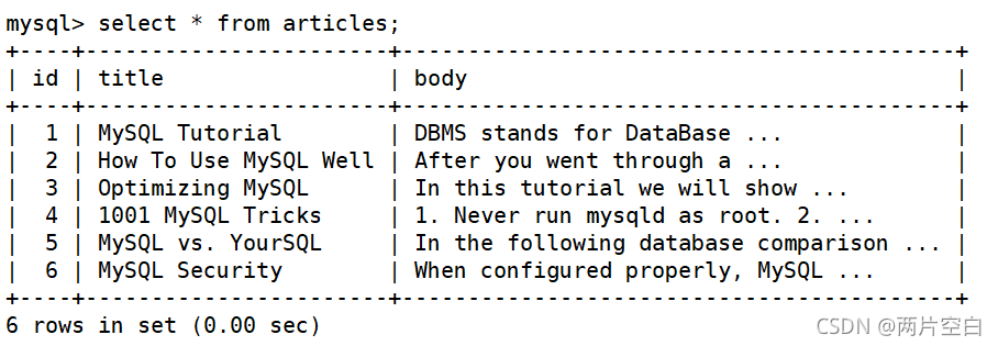 CREATE TABLE articles ( id INT UNSIGNED AUTO_INCREMENT NOT NULL PRIMARY KEY,