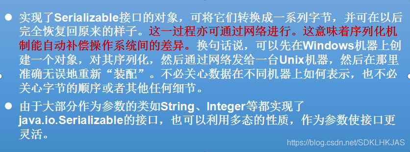 序列化的好处在于可将任何实现了Serializable接口的对象转化为字节数据,使其在保存和传输时可被还原