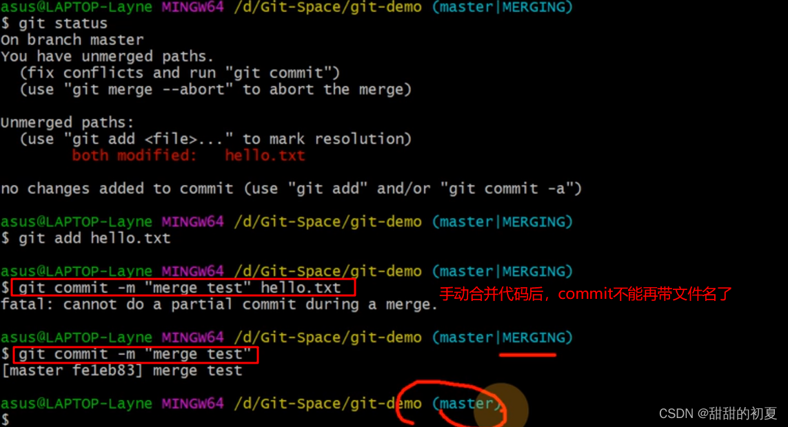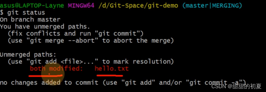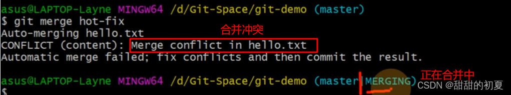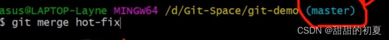 如果想把hot-fix分支合并到master分支上,应该位于master分支,输入git merge hot-fix