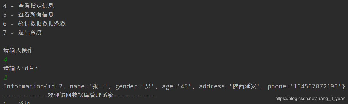 + "3 - 修改 \n" + "4 - 查看指定信息 \n" + "5 - 查看所有信息 \n" + "6 - 统计数据数据条数 \n"