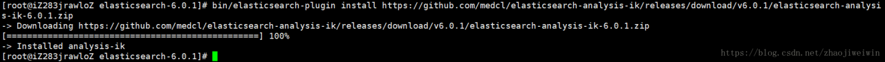 在es目录下执行:bin/elasticsearch-plugin install https://github.com/medcl/elasticsearch-analysis-ik/releases/download/v6.0.1/elasticsearch-analysis-ik-6.0.1.zip